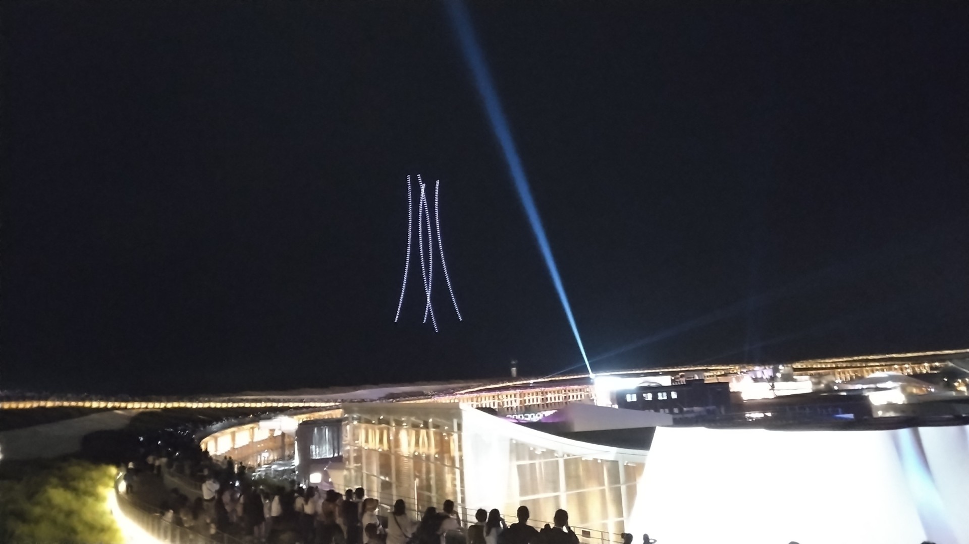 夜までいる予定だったので、大屋根リングをはじめライトアップの会場も楽しめました。昼間とはまた違った素敵な会場になり、最後は花火とドローンショウまで見て会場を後にしました。