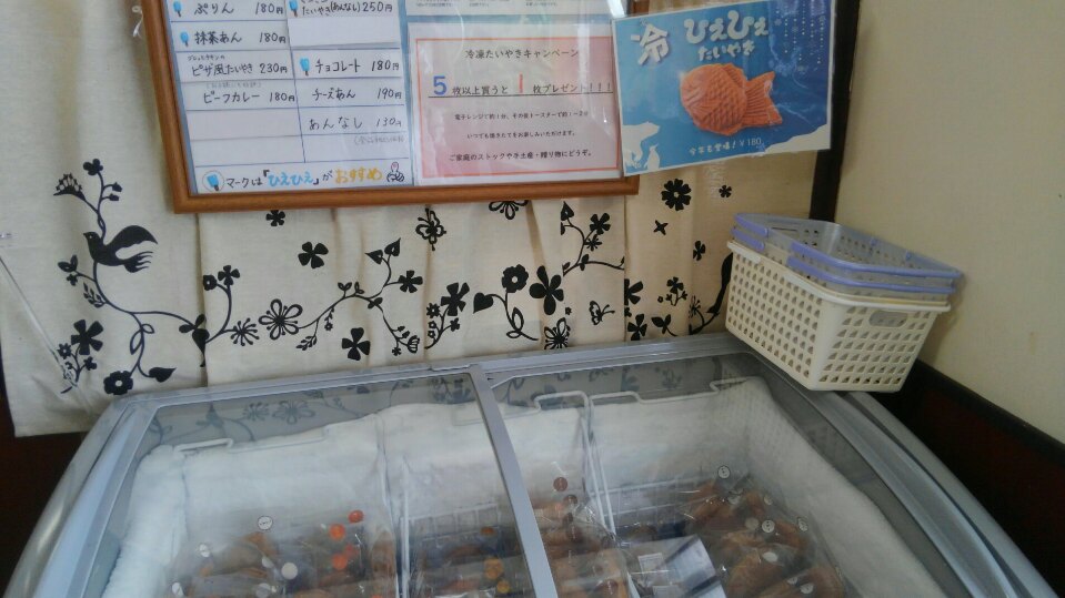 暑い日だったので「冷たいプリンたい焼き」と、その後寒くなったので(笑)「抹茶餡たい焼き」を食べてきました。冷たい方はアイスの冷凍庫から自分で出して電子レンジで温めるというレトロなシステムで、心がホッとするひとときでした。