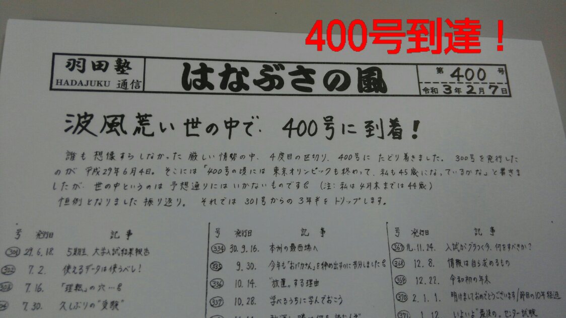 そして、長く続けていると言えばもう1つ。開塾以来隔週(時には毎週)発行している通信が、今日の発行分で400号に到達しました。300号到達は約3年半前の平成29年6月4日。その300号では「また400号に向けて頑張ります。その頃には東京オリンピックも終わって私も45歳になっているかな」と書いて締めくくっていましたが…世の中はなかなか予想通りにはいかないものですね(私は4月末まではまだ44歳)。