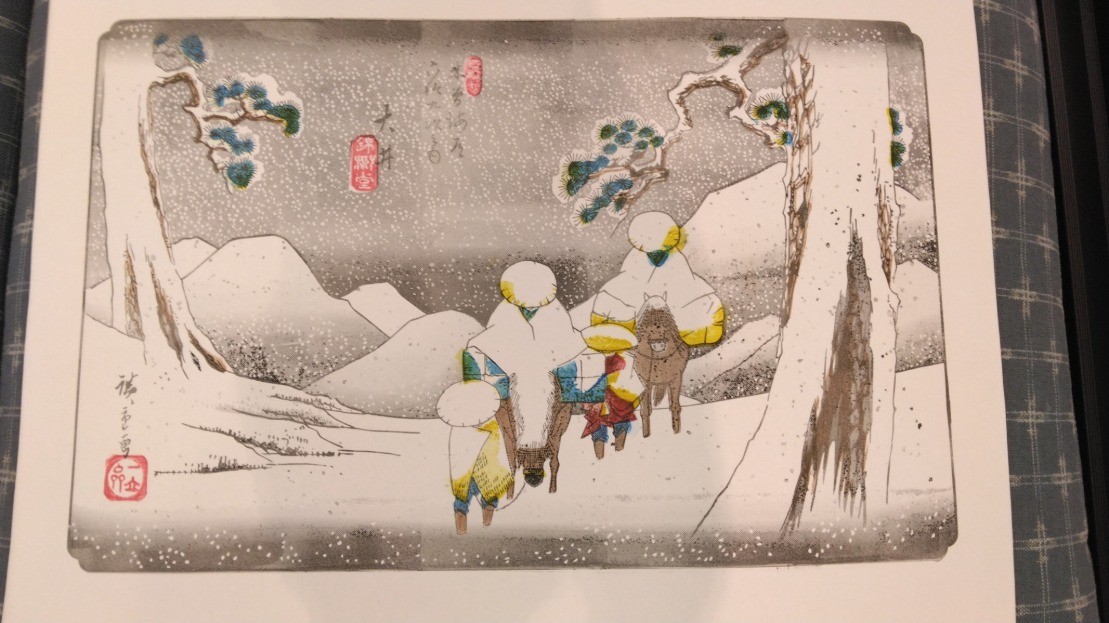 さらに9月と同じ目的地、駅前通りの中山道広重美術館へ。今回は3部構成のうちの後期展示の期間で、前回と同じく版画を体験して、展示を見てきました。このHPでも紹介している私の恒例のウォーキングはこの先中山道をたどる予定なので、今回の展示を無事に拝観できて参考になりました。