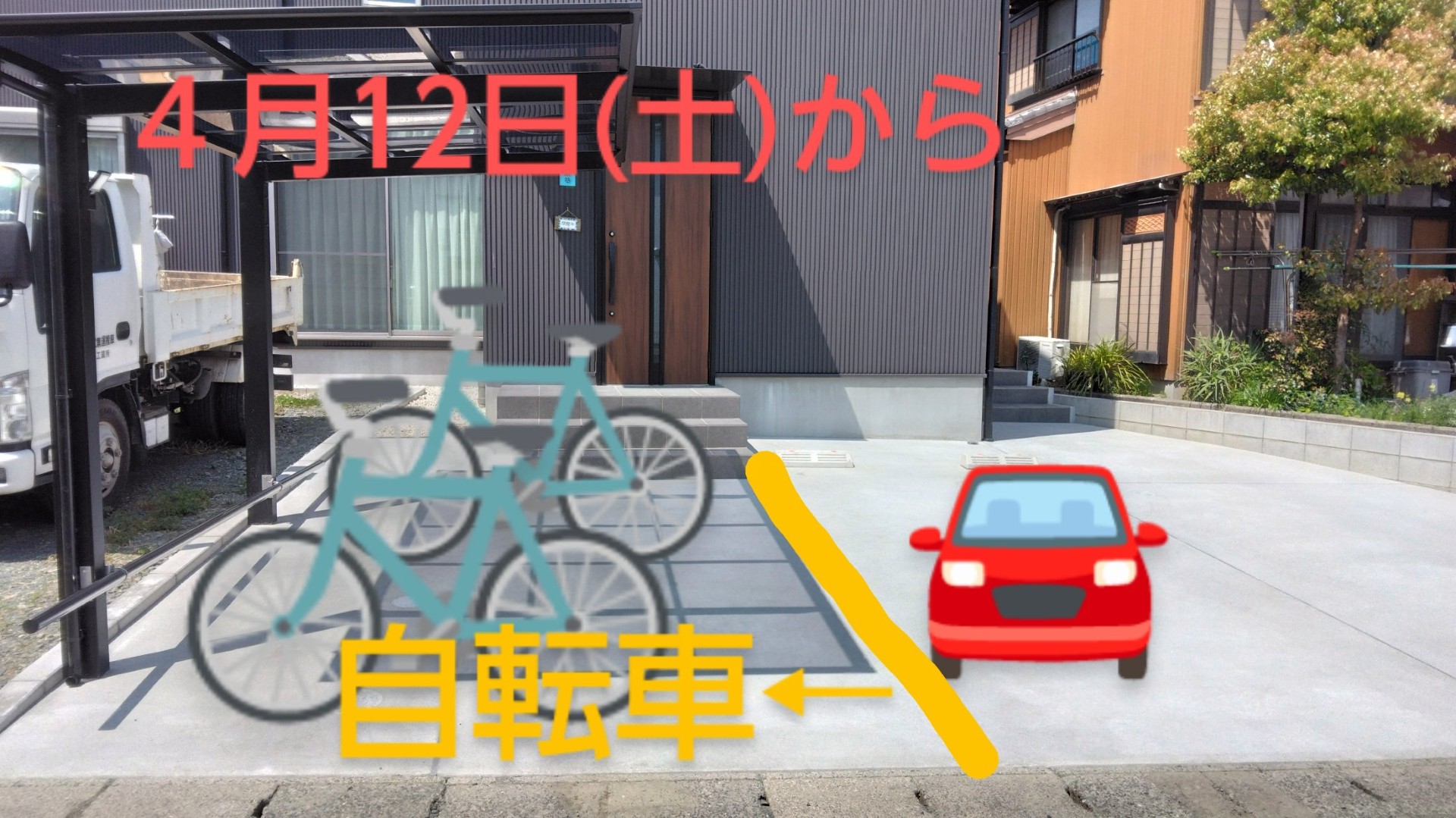 今後は下の写真のように、自転車は向かって左側のサイクルポート下へ停めて下さい。鍵は必ずかけて、必要ならば車輪止めにロックチェーンも繋げます。また、お車で送迎の際は必要に応じて真ん中の車止めのある部分をご利用ください。よろしくお願いします。