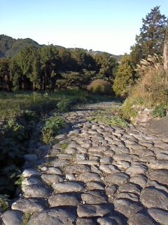 せっかく上ったのに今度は下り坂。こちらは「菊川坂」と呼ばれて同じように石畳が敷かれています。いつも思うのですが、人間の足って下り坂の方が負荷がかかりますよね。もちろん上り坂の方が位置エネルギーを得るために力が必要なのは言うまでもないのですが、転がってしまうのを止めるために膝にかかる負荷は絶対に下り坂の方が大きいと思います。しかも下りの石畳なんて…。写真だと下り坂をあまり認識できないかも知れませんが、転ばないように、足をひねらないように相当気をつかいました。歩き始めて1時間で早くもかなりお疲れ。でもこれはまだまだ序の口でした。