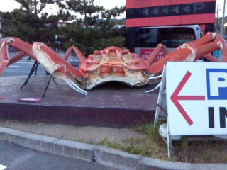 さて上の右側の写真は実は午後から撮り直したもので、実際の今回のウォーキングの出発時刻は午前4時50分という「ちょっと明るくなりかけたかな」という時刻でした。だから実際の出発時の駅舎は下の左の写真です。駅名標、読めませんよね。ちなみにここから10分も歩かないうちにカニのモニュメントを見つけたのですが(下の右の写真)、こちらはもうすでにかなり明るくなっていました。この時間帯の10分の違いってとても大きいですよね。こんな事も大自然の中を歩いているから発見できることだとちょっと自慢げです。
