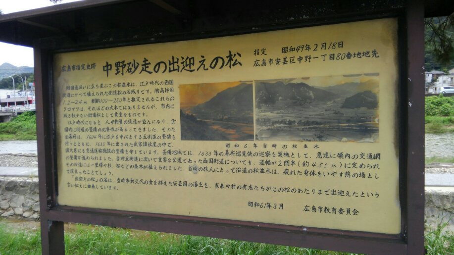海田市を越えた辺りから、瀬野川に沿った素敵なコースになるのですが、国道2号線の対岸にひっそりした県道が並走しているので、こちらを歩くことにしました。この海田市から中野東までの間の瀬野川右岸の細い県道、春日大社参道前がスタートからの4350km地点になりました。旧山陽道(西国街道)らしいので、他にも所々に歴史を感じさせるものも残っています。この松並木もその1つ。かつては領主や領民を出迎えた松が、今朝は河川敷を散歩する犬と老人を見守っています。