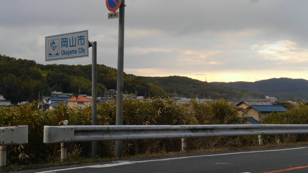 造山古墳を左手に眺めながら、とうとう総社市を後にして岡山市内へ。まだまだ山が迫っている道の風景ですが、まぎれもなく岡山市内です。小さなアップダウンをくり返しているうちにかなり夕暮れの暗さが勝ってきました。西日本とは言えもう10月下旬。そして雨によるどんより空。本当は岡山駅まで歩き切りたかったけど、そろそろゴール地点を設定しないといけない時刻が迫ってきています。