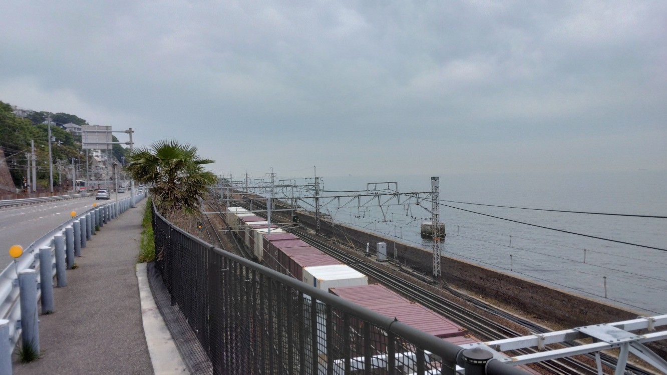 まだまだ国道は海に沿って伸びていきます。山と海の狭い間に国道と鉄道が並走している様子は、スケールこそ違えど静岡県の由比にも似ている感じがあります。ちょうど貨物列車が通ったので潮風をモロに浴びながら橋の上で1枚撮りました。